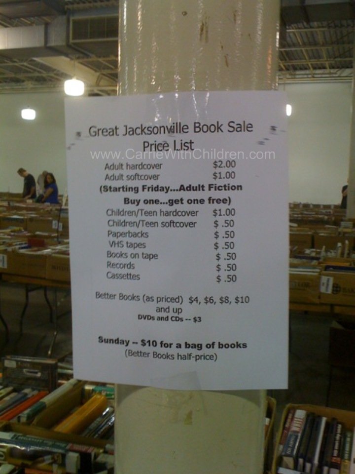 Today was a special day for local book lovers. A day that many have had circled on their calendars for months (myself included). Our local “Friends of the Library” organization hosted its bi-annual used book sale with all the proceeds benefiting the library. Trust me when I tell you that there are literally books as far as you can see. It’s overwhelming for first-timers attending the sale. It’s not uncommon to see people wheeling suitcases out of the sale filled with nothing but books. Just take a look at this price listing and you’ll instantly understand why it is a book lover’s dream.