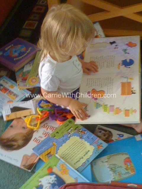 I walked away from the sale today with 24 kids books for only $19. BARGAIN! I only allow myself to take one small bag and once it’s full – I call it quits. I ended up with books of Sesame Street, the Backyardigans, Dora the Explorer, the Berenstain Bears and more. Maggie enjoys “reading”, she even has her own bookshelf filled with books. I’ve found that used books are perfect for kids. If one gets ripped, who cares it cost 50cents. These days, her books are more likely to get attacked by crayons. When I got home and showed Maggie her new books, she instantly took the bag, dumped them out in the floor and started “reading”.
