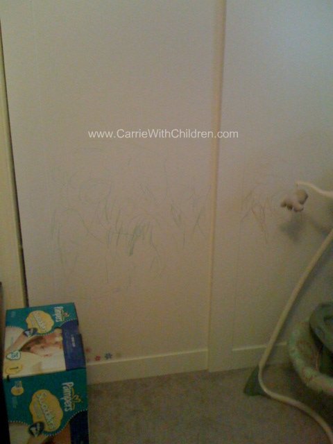 Yep, don’t let your eyes deceive you – she colored all over Molly’s closet doors. Green, brown and red (which don’t match the room). The label says they are washable crayons, but I still haven’t gotten the nerve to see for sure.