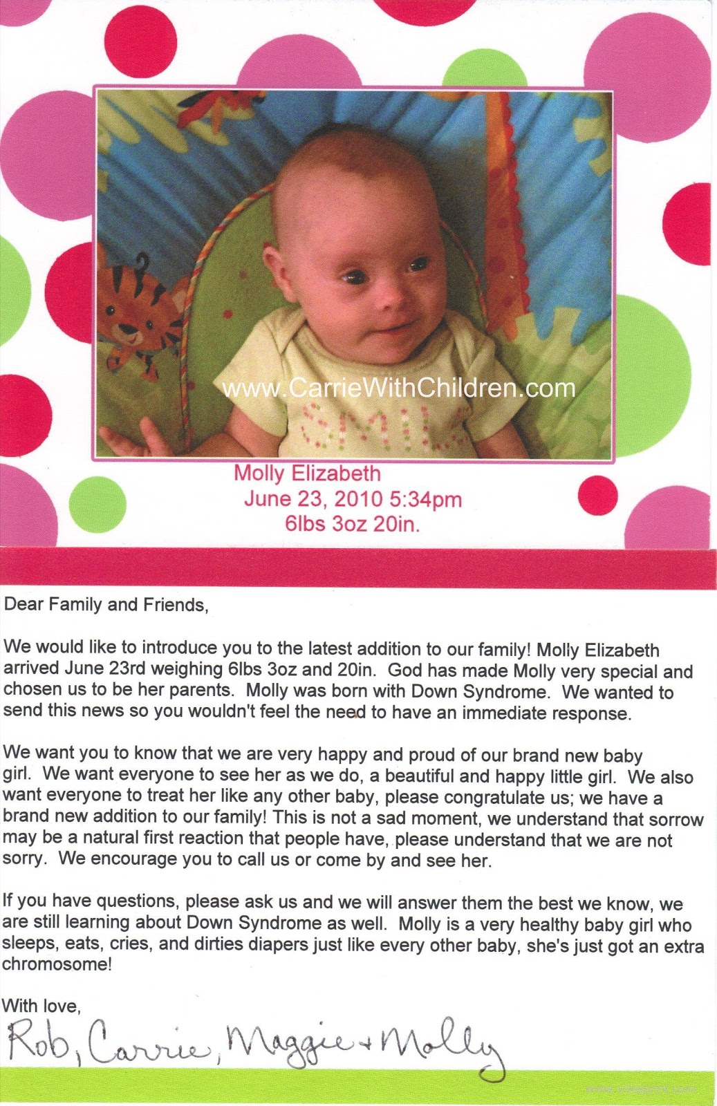 I have a beautiful daughter named Molly who will turn 6 next month, and she just happens to have Down Syndrome too! My husband was stationed at Mayport when she was born, and we didn't know her diagnosis until birth as well. Your birth announcement is wonderfully worded – brought back lots of memories of telling our family and friends the news. We had a wonderful pediatrician who set Molly up with speech and OT therapies when she was 2 months old. Our Molly's have a lot in common – she has always been a great eater and sleeper too! We LOVE Hope Haven and the Down Syndrome Association of Jacksonville. Such great organizations! My husbands career is bringing us back to Jacksonville for 6 months of training this coming year, and I am looking forward to reuniting with many people who got us off to a great start with our daughter. Molly is in Kindergarten and doing beautifully. It would be nice to meet you and your Molly (and Maggie too) when we get back to Jax. My email is jenniferfiala@hotmail.com.