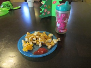 Maggie, my persnickity toddler, seemed a little surprised by having a sandwich, so she had what we lovingly called a “deconstructed chicken sandwich“. It was the actual sandwich, but chopped up on a plate – including the cheese, ketchup and even the bun! She loved it!